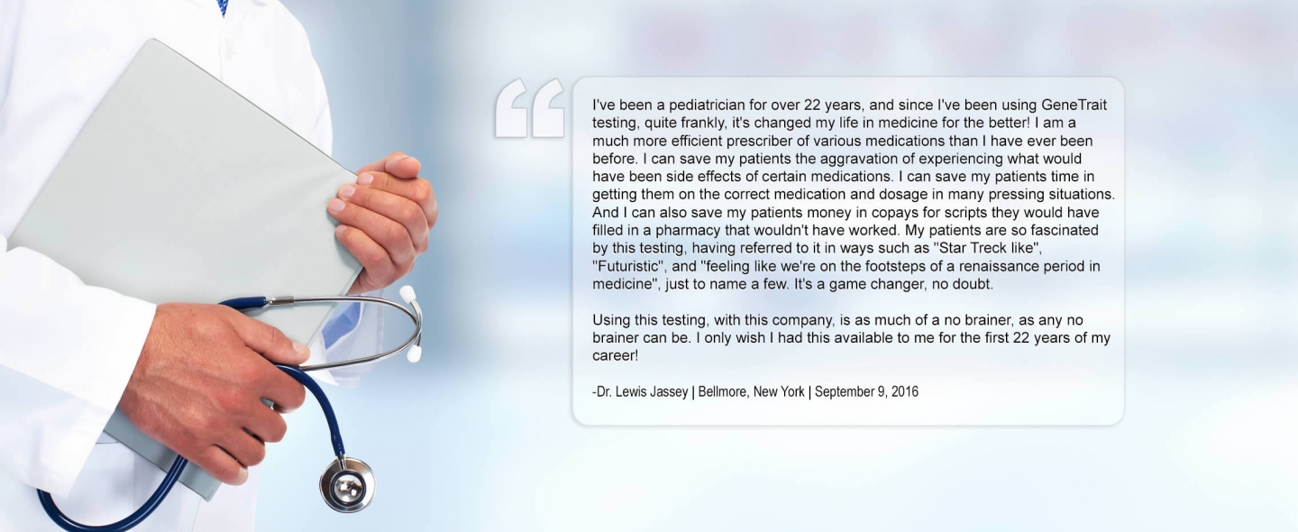 Advances in science make it possible to better predict your medication response and identify potential health problems before they start. Pharmacogenetics is a type of genetic testing which can help patients avoid much of the trial and error associated with developing an effective treatment plan. This powerful, proactive information allows doctors to treat each patient as a unique person. Personalized medicine using genetic testing can assist in quickly improving your quality of life, lowering unnecessary medication costs, and reducing the risk of possible side effects. A GeneTrait pharmacogenetic test is easy, accurate, and provides lifelong benefits to anyone beginning a new medication regimen or having difficulty with their current medications.